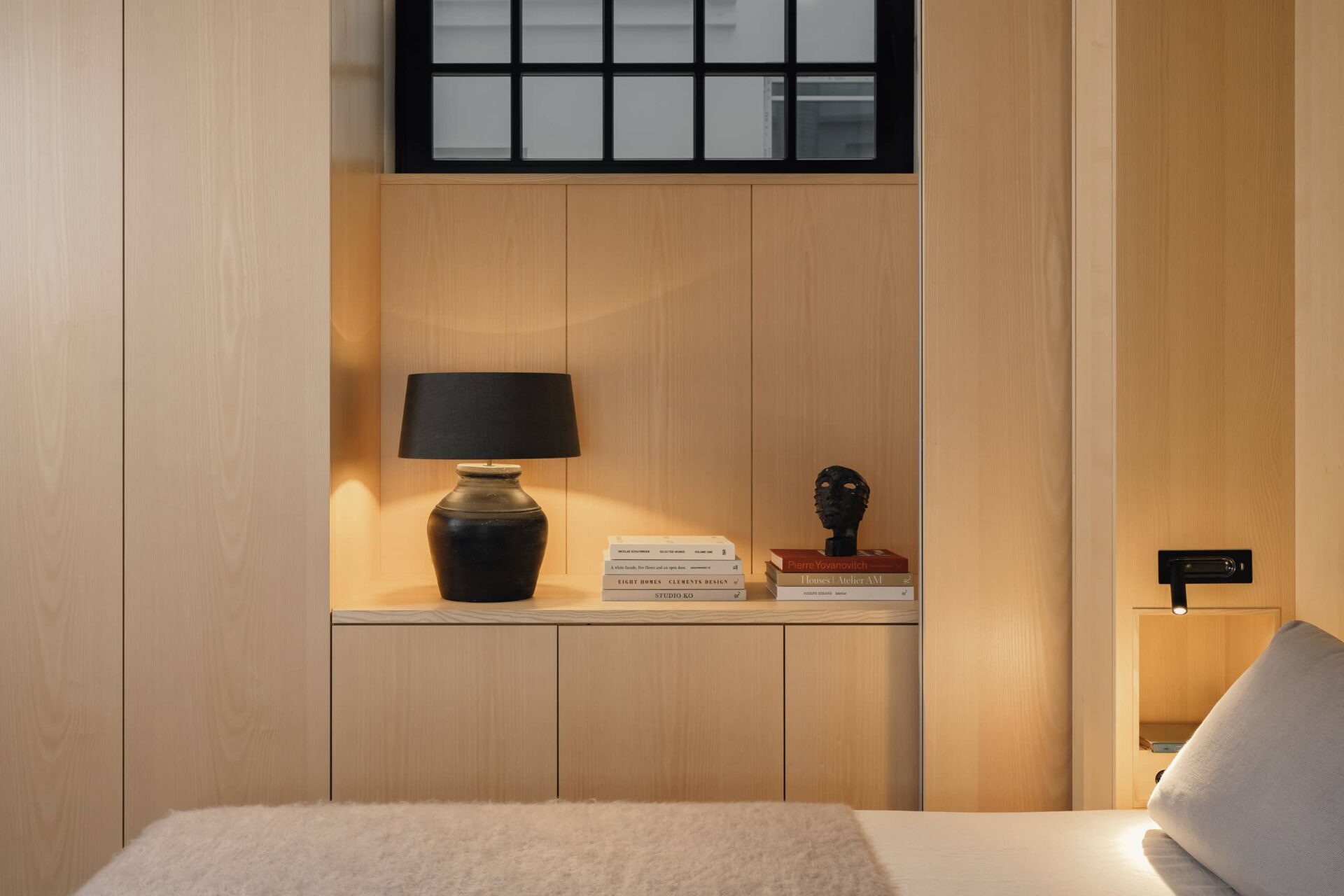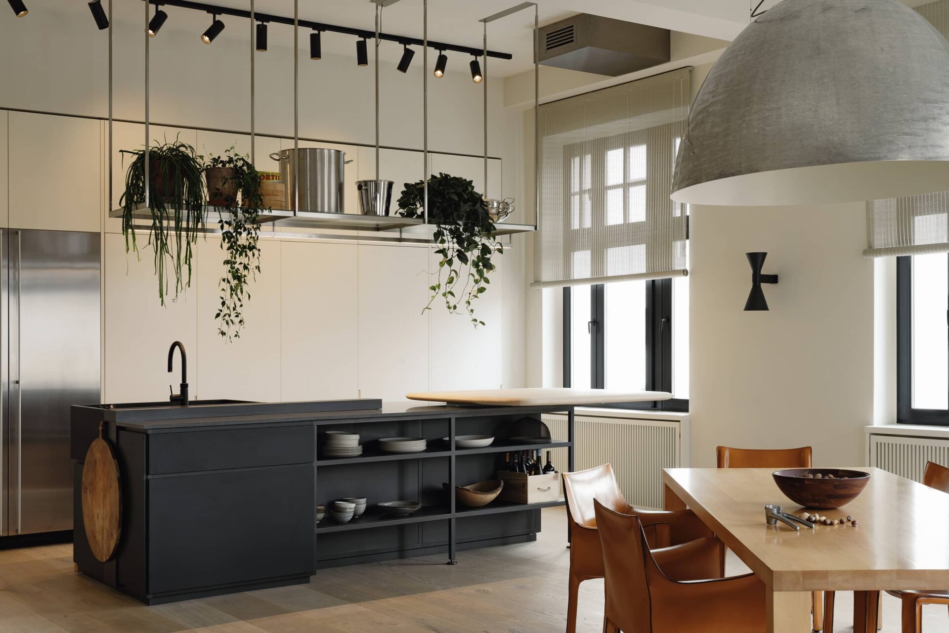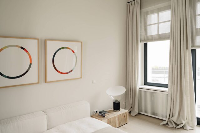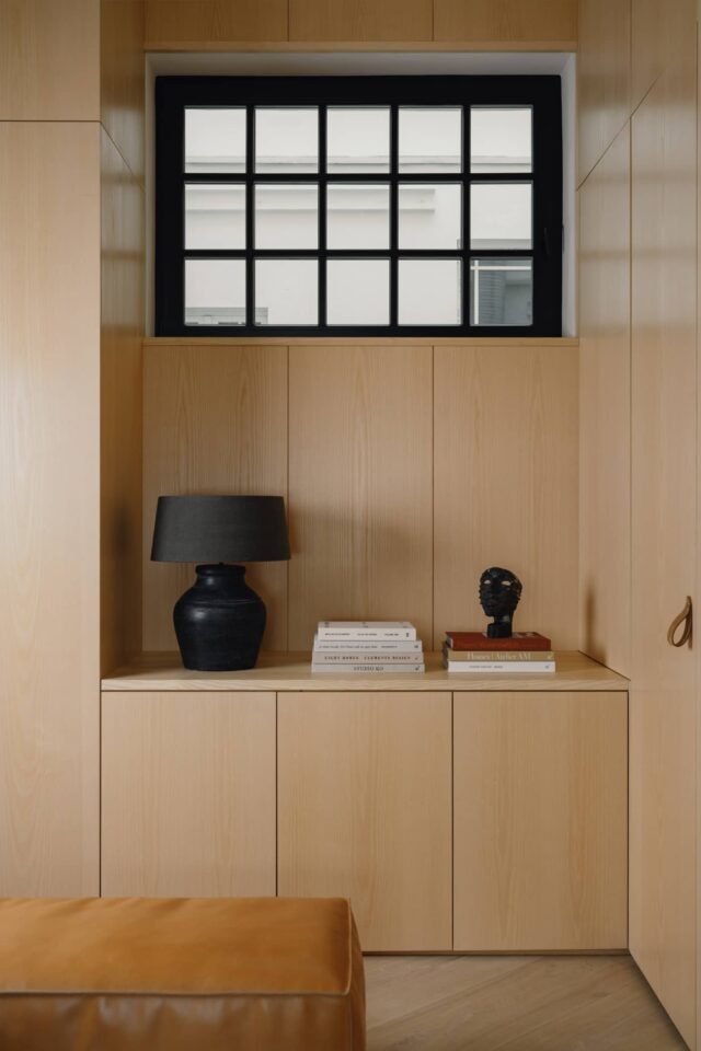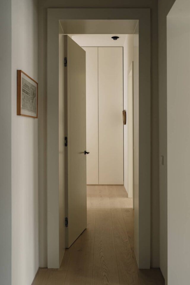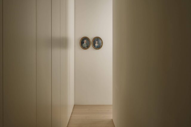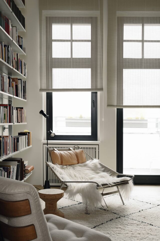 220sqmThis 250 sq m apartment is situated in a landmark building in Berlin’s historical city center. Our London clients were looking for a pied-à-terre for the weekend as well as for prolonged stays and also needed a guest room for family and friends. The complete renovation of the flat included new wide panel oak floors, new black windows with bamboo and linen window treatments, a new kitchen, a library and a walk in wardrobe that also functions as the guest room with a fold out Murphy bed.