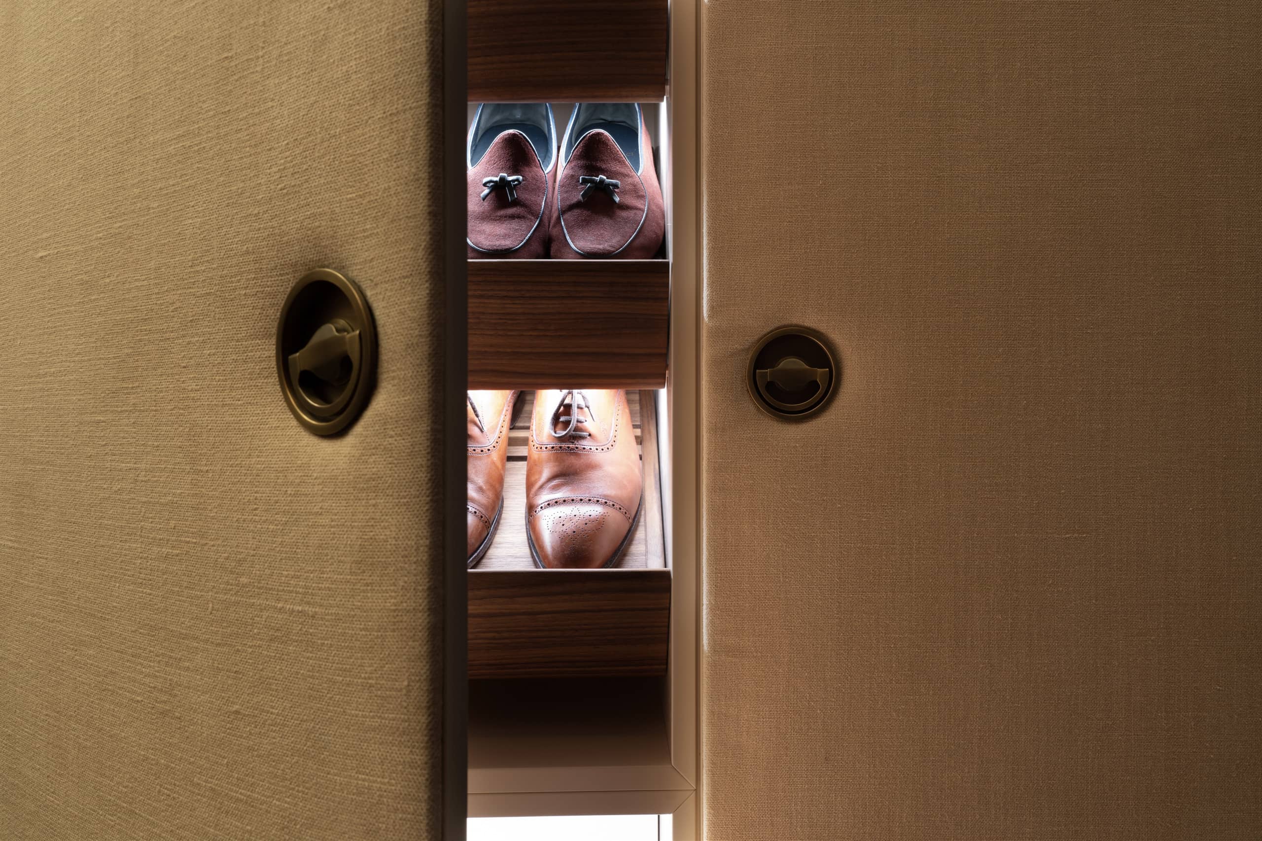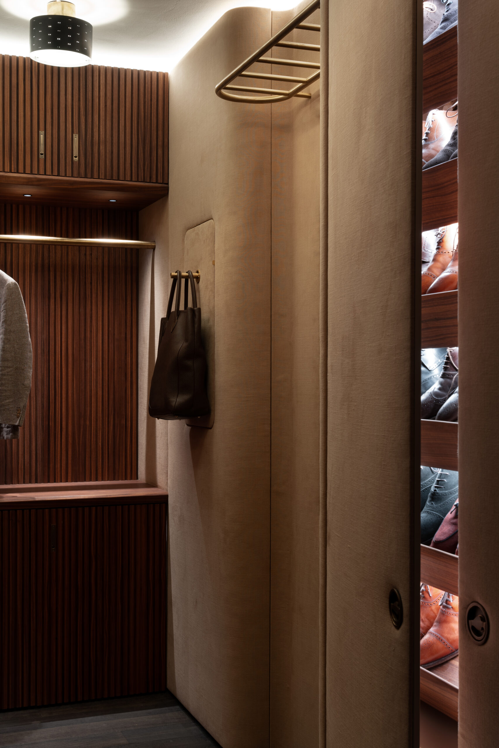 15 sqmThe idea for this dressing room was rooted in the world of prestigious travel of a bygone era. Due to the rather small space available, we designed cupboards, drawers, boxes, hooks and meandering rails with minute details in order to stow away what creates clutter leaving in the open only what needs to be readily available.