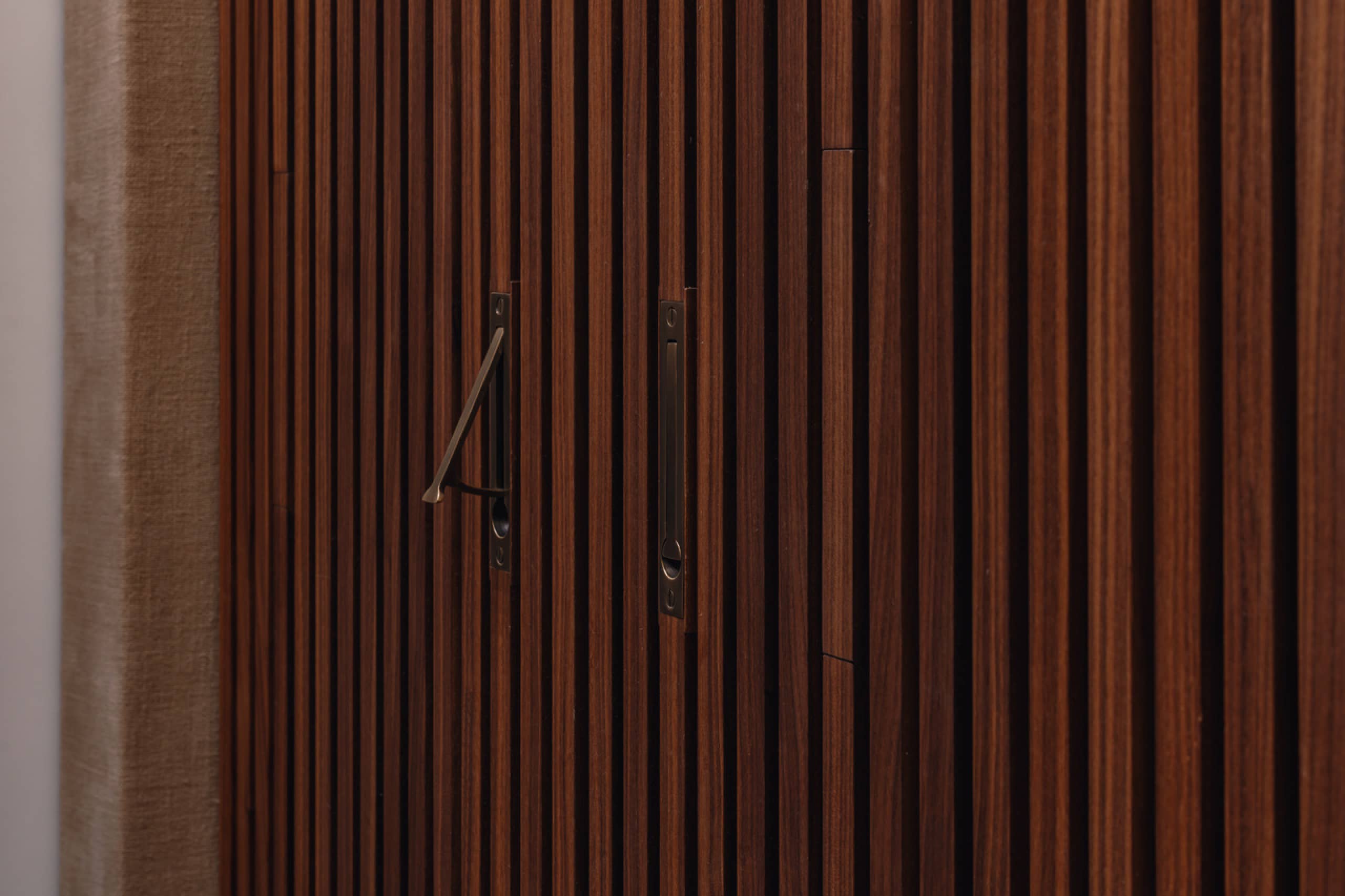 American walnut and brass being the materials in use, all hardware was custom made and the doors and panels steam bent into shape. The ceiling lights are Paavo Tynell and the pendant is Alvar Aalto.