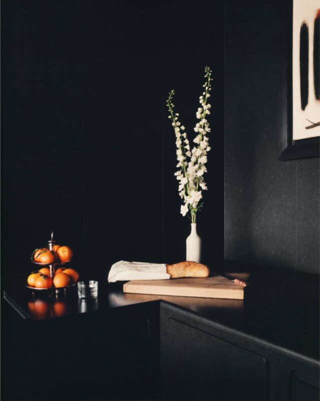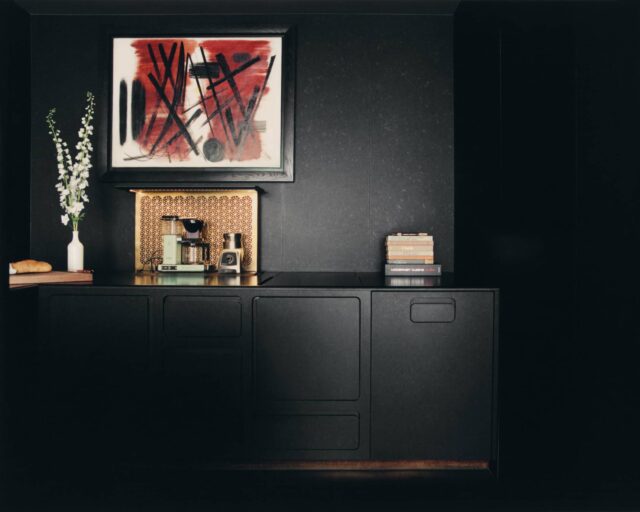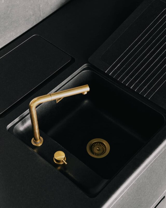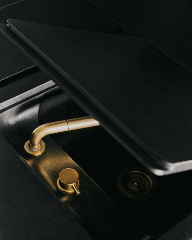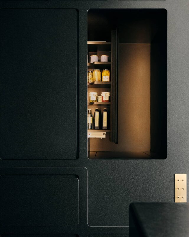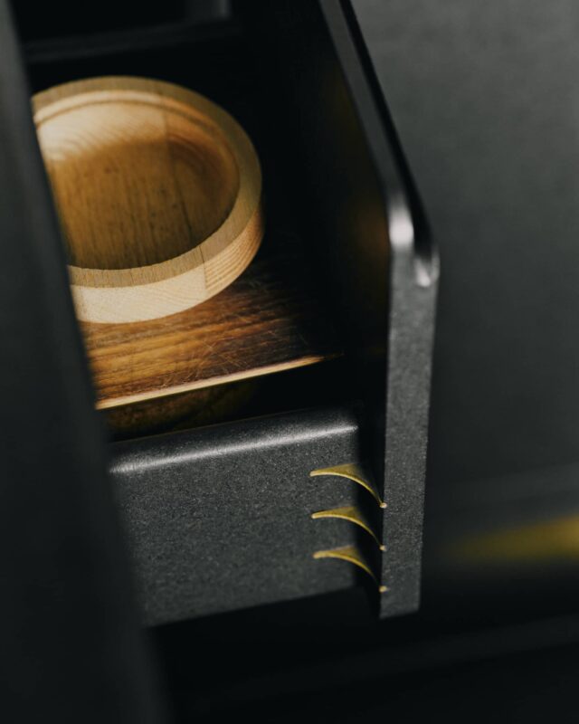 We developed drawers carved from granite blocks, weighing 40kg each, attached to fronts with brass connectors, a sink hidden beneath a lid, with a pull-out faucet, an electrical vertical drawer, and doors, and flaps, and more lids.